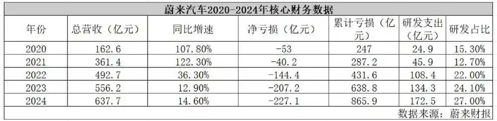 成立以来,因为居高不下的各项费用以及“换电模式”持续烧钱,蔚来这些年一直在亏损,其中2021年至2024年,分别亏损40.2亿元、144.4亿元、207.2亿元和227.1亿元。这些年累计亏损已超1000亿元。